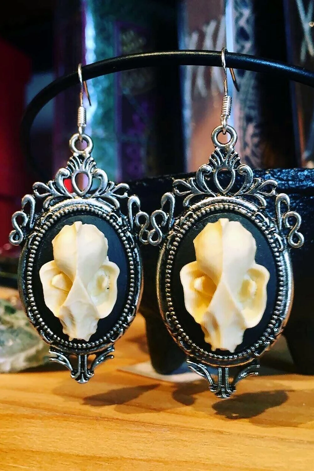 Take flight in these beautiful bat earrings, made in bat caves for taxidermy collectors and Victorian goths! Encased in floral cameo frames, these romantic goth earrings feature realistic bat skulls resting on black plaques. Designed to add instant spooks to any goth outfit.