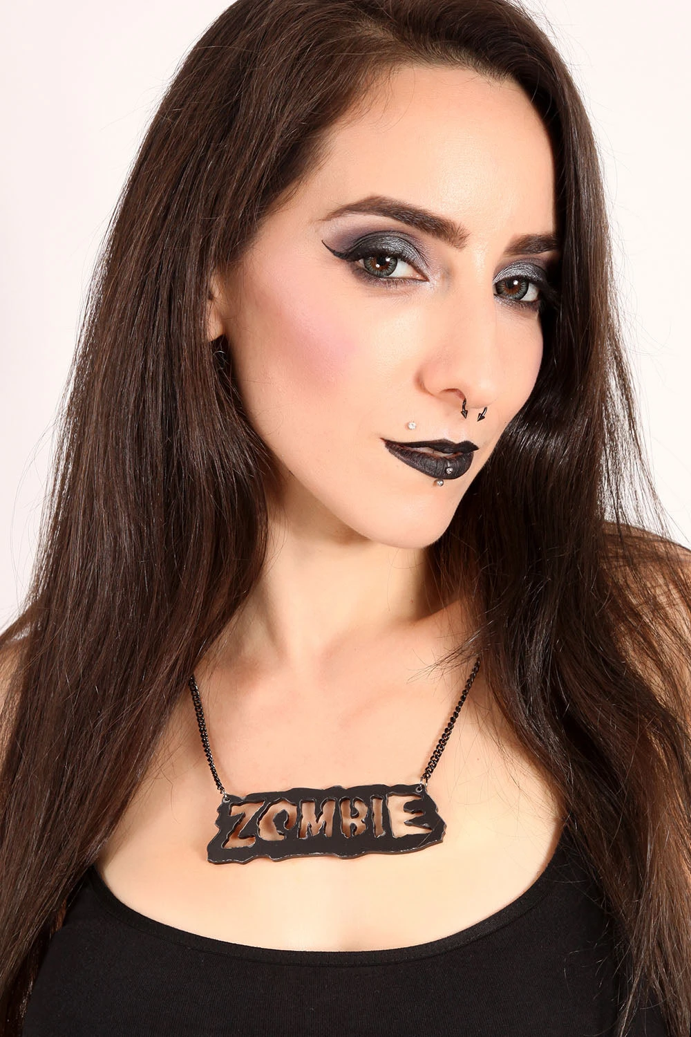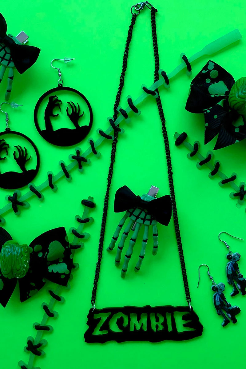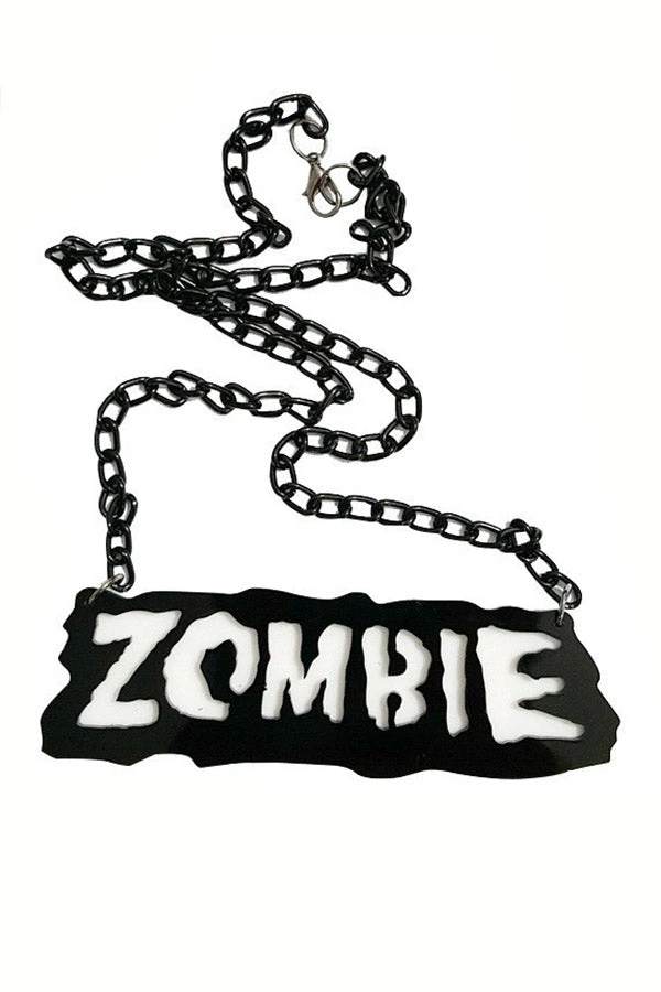 Zombify your look with this drop-dead-gorgeous necklace, featuring the word ZOMBIE in ooky spooky font. Bring death wherever you go in this horror necklace, designed to break hearts and blow brraaiinnss. Be sure to remove the protective sticker before wearing to reveal the zombie charm in all its goth glory!