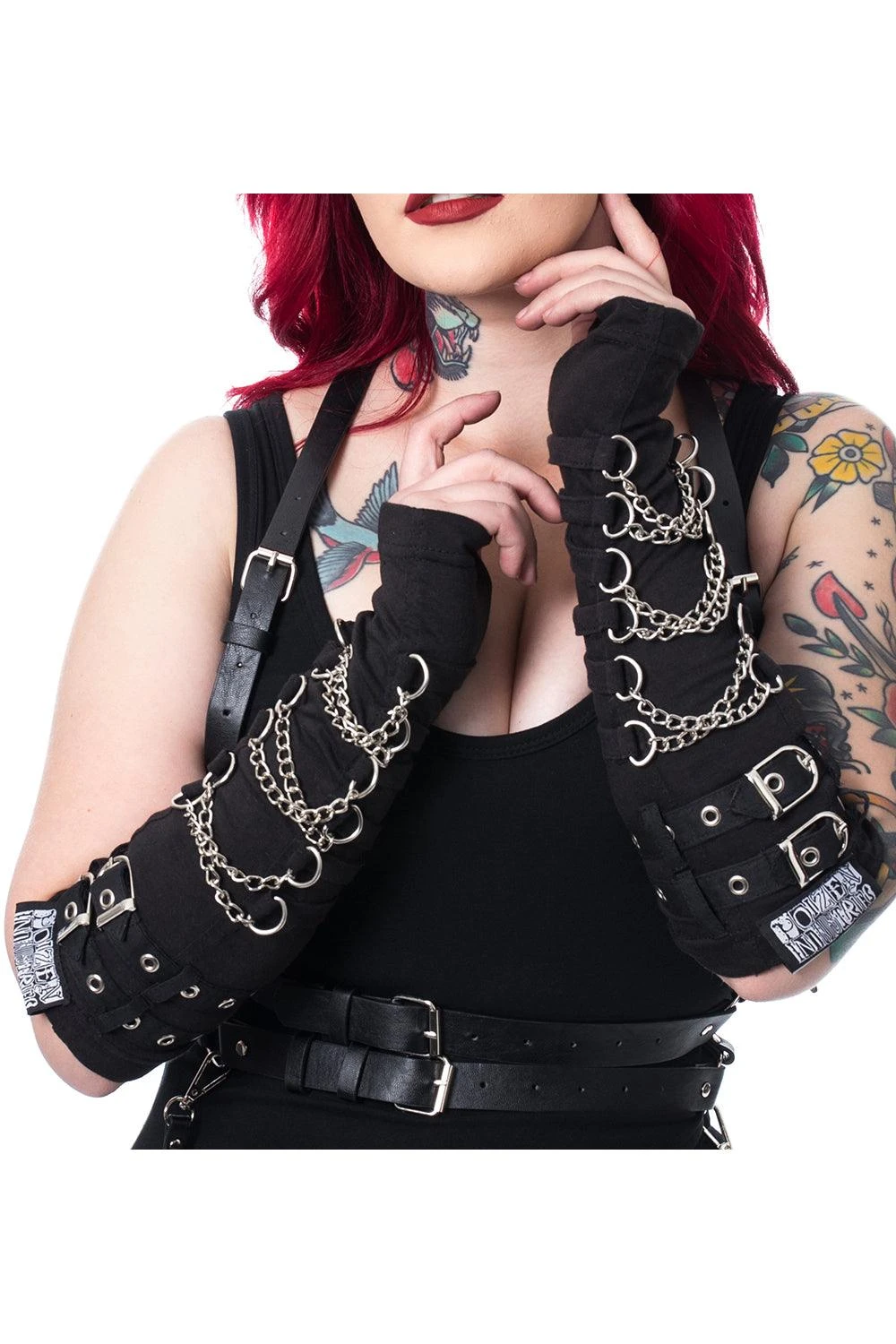 Accessorize your appendages (and scare the sh!t outta your neighbors) in these gothic arm warmers! Made of stretch cotton, these oh-so-comfy armwarmers do so solemnly swear to keep your fine self fiendishly cozy. Featuring metal chains, d-rings, and metal buckles, normies swoon and shudder in your wake!