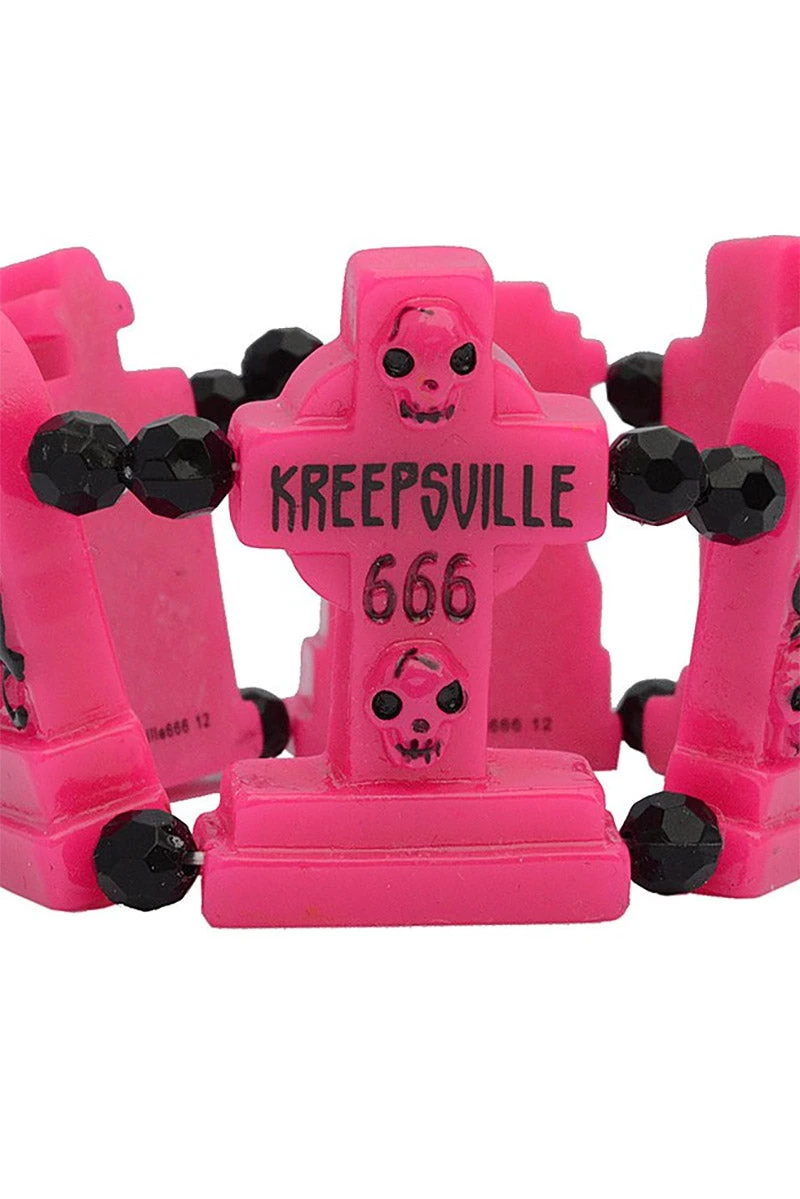 Haunt the cemetery with this hella hot pink bracelet around your wicked wrist! Constructed of lightweight plastic, this ooky spooky bracelet features bright pink 3d charms shaped like headstones. Black accent beads possess the elasticated cord for chills and thrills. Perfect for mistresses of the macabre and graveyard groupies.