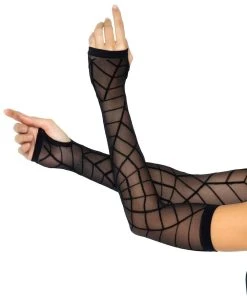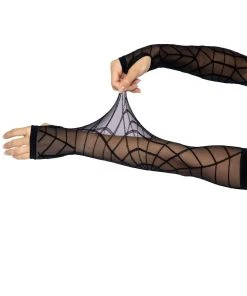 Haunt your arms with these beautiful black gloves! Soft and stretchy, these gothic gloves feature a sheer mesh fabric, bewitched with spooky spiderweb detailing! A fingerless design, these statement arm warmers are complete with thumbholes so you can freely text + hex.