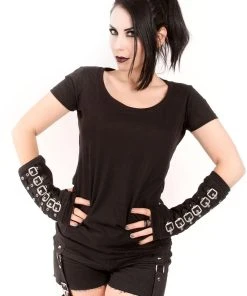Haunt your arms in these killer goth gloves, loaded with an arsenal of buckle straps! Made of soft stretch cotton, these gothic arm warmers feature silver eyelets and adjustable accents straps all down the front for the perfect punk fit. Finished with thumbholes so you can freely text + hex.