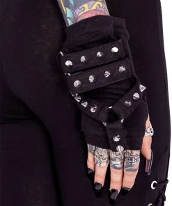 Haunt your hands with these gravely goth arm warmers! Soft and stretchy, these statement gloves are possessed with metal rivet spikes all over. Conjure creeps in the fingerless design, complete with thumbholes so you can freely text + hex. Finished with an adjustable velcro closure for the perfect punk fit.