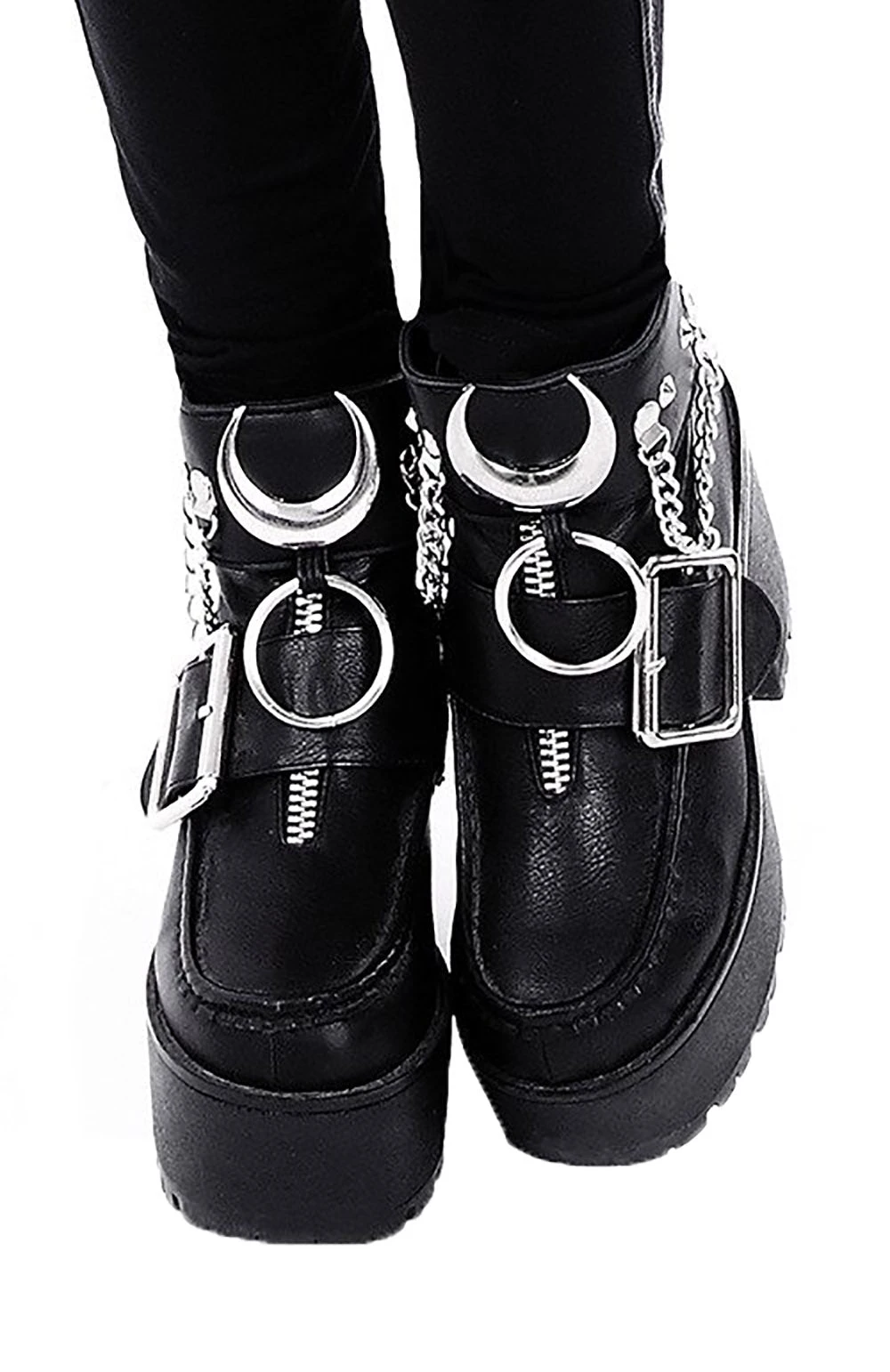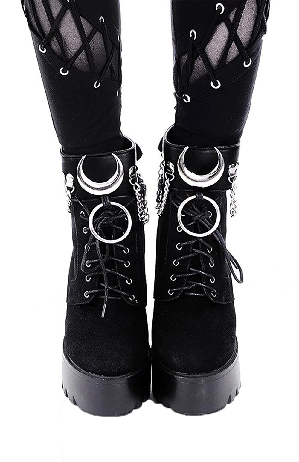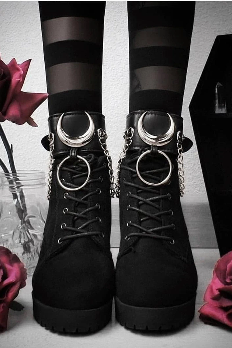 Bewitch your feet in these witchy shoe cuffs, made for midnight promenades with the moon! Spellbind your shoes with the metal crescent moon decorations, large o-rings, spikes, and chains. Looks magical on heels, ankle boots, pumps… whatever your black heart desires!