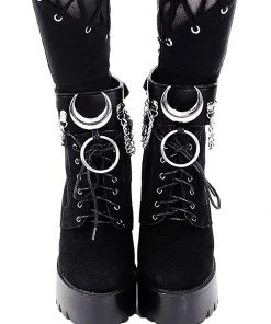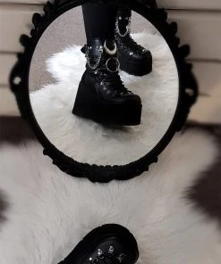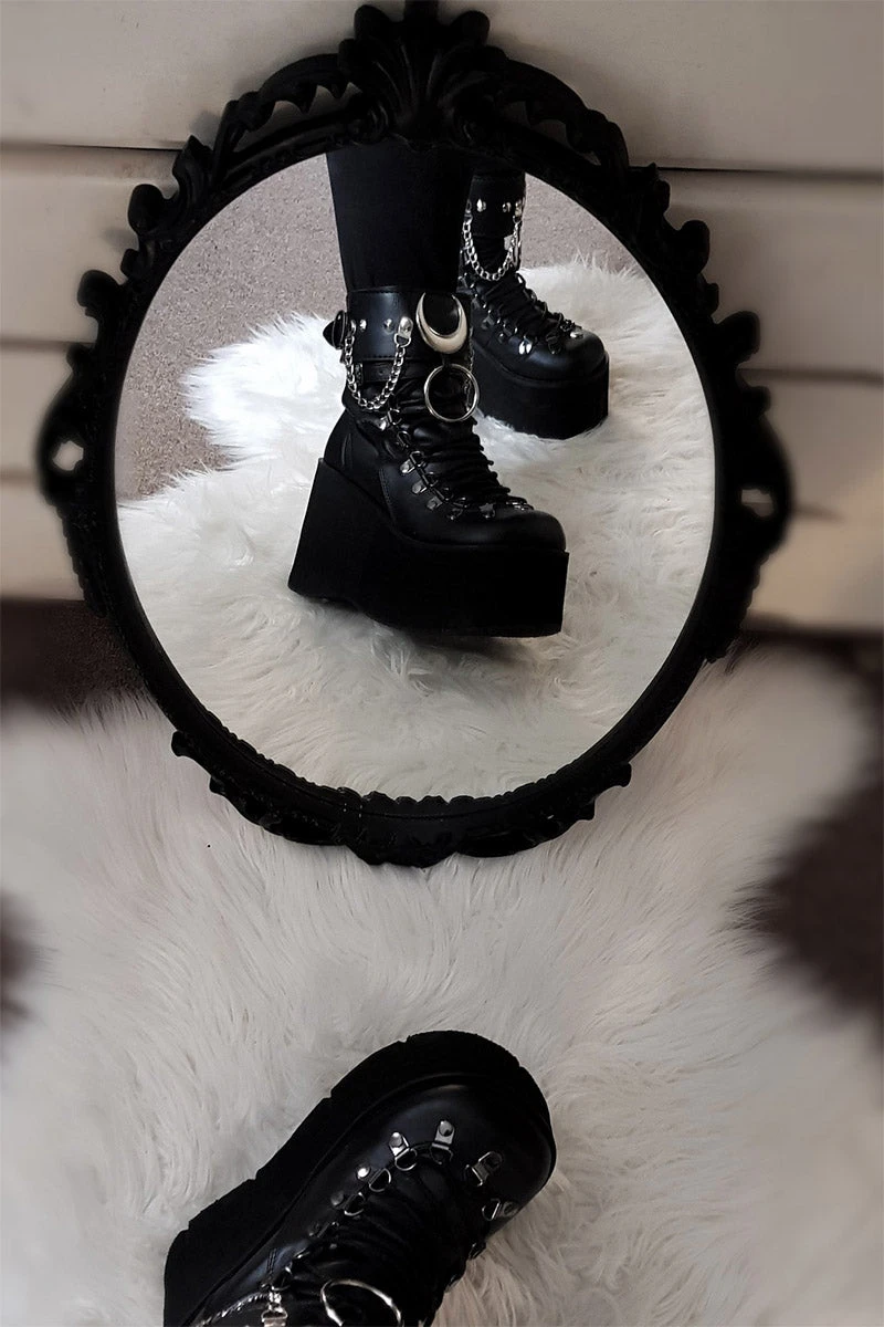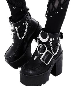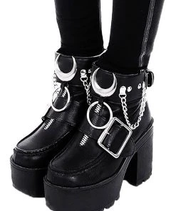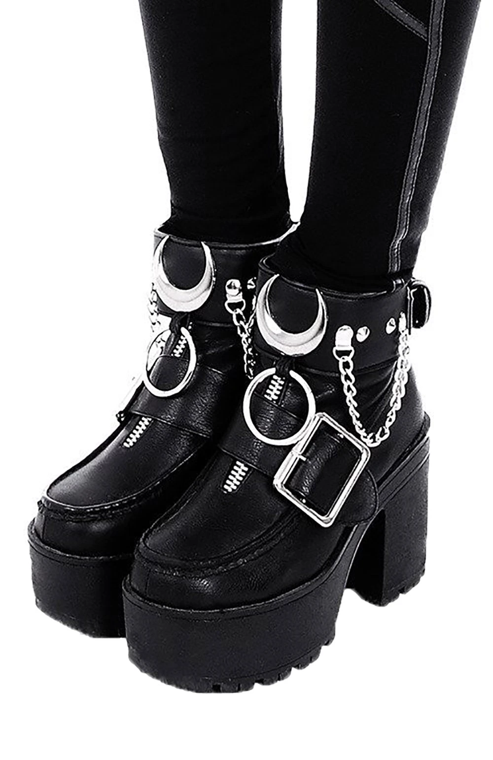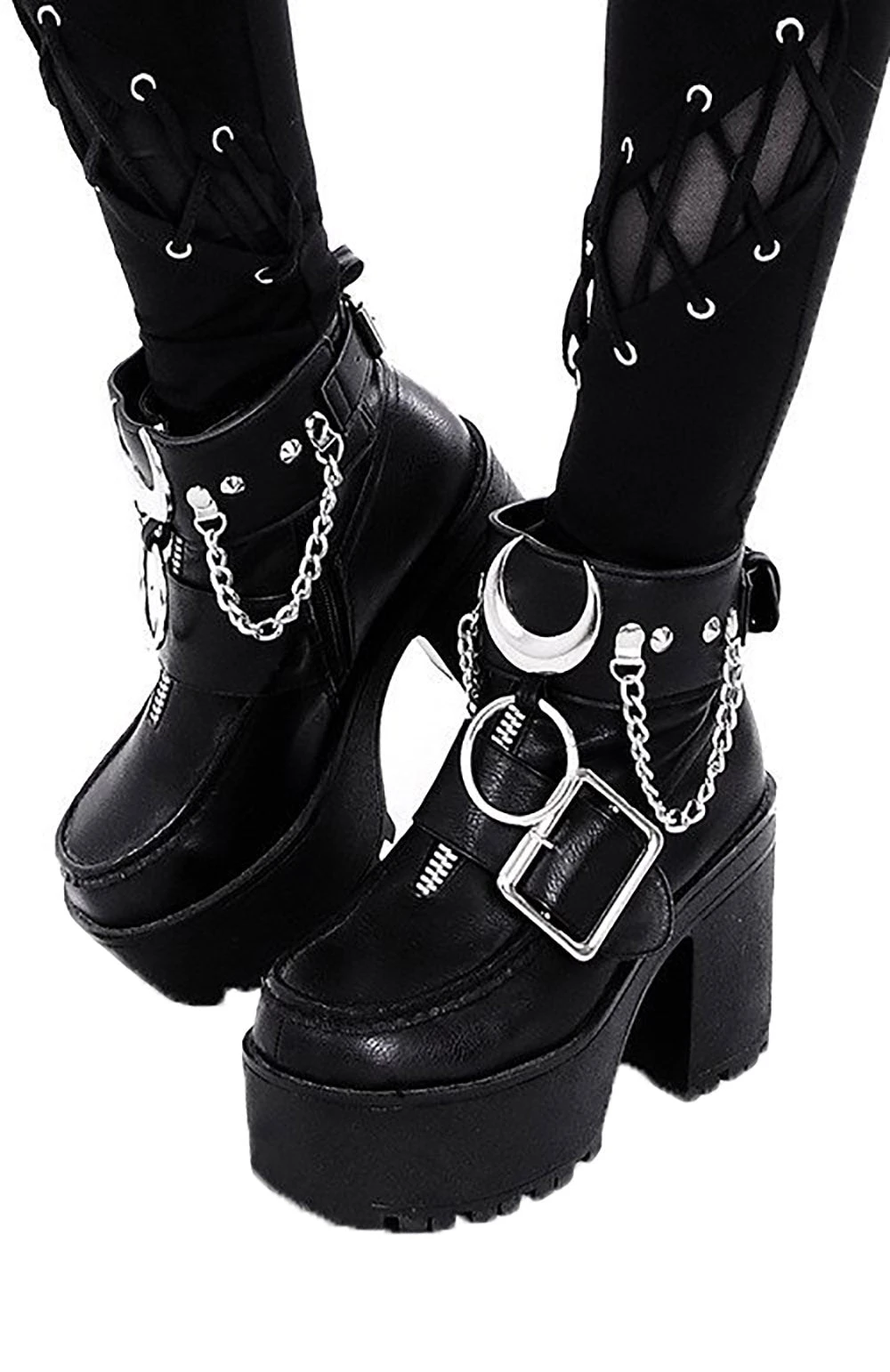 Bewitch your feet in these witchy shoe cuffs, made for midnight promenades with the moon! Spellbind your shoes with the metal crescent moon decorations, large o-rings, spikes, and chains. Looks magical on heels, ankle boots, pumps… whatever your black heart desires!