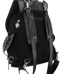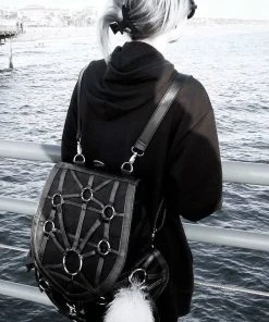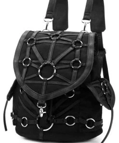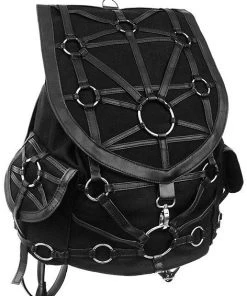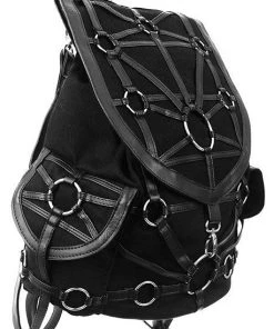 Tote your evil essentials in this bondage backpack, loaded with metal o-ring hardware. Haunt the day with the black denim fabric, geometric designs, and vinyl leather accent straps. With loads of pockets and a spacious lined interior, this gothic backpack’s got plenty of room for holding your smokes, sage, and satanic bible.