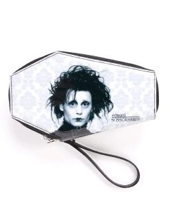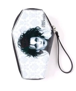 Let Edward protect your monies in this spooky scissorhands wallet! Made of quality vegan vinyl, this gravely goth wallet features Edward Scissorhands haunting a pretty fleur de lis pattern and creepy coffin shape! Keep your credit and debit cards safe in the multiple card slots—store your coins in the zippered change pocket. Officially licensed and lined with a cobweb interior to please your unbeating heart.