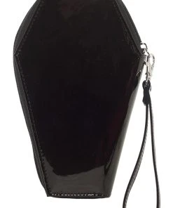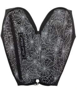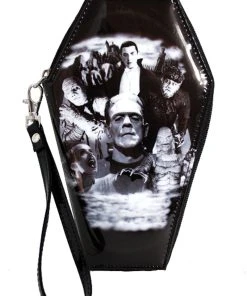 Tote your macabre money in this killer monster wallet! Made of quality vegan leather, this wicked wallet is haunted by Dracula, the Mummy, Frankenstein, his Bride, the Wolfman, and the Creature from the Black Lagoon! Keep your ID card safe in the interior card pocket—protect your cash in the main compartment and zippered coin pocket. Complete with a gravely goth cobweb lining and shaped like a coffin! Officially licensed and beautifully made to please your cold, dead heart.
