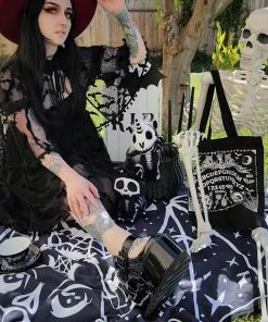 Conjure purranormal activity with this spooky spirit board tote bag! Features a mystical ouija board possessed with cat skulls, cobwebs, moths, bats, pentagrams, and more! Perfect for carrying your tarot cards, smokes, and cat food.