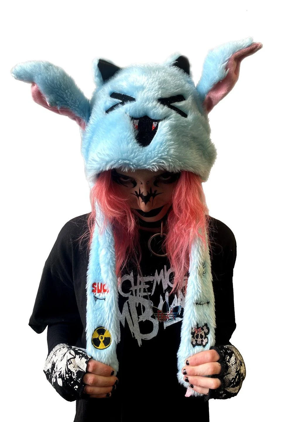 Be your battiest bad self in this spooky bat hat! Haunt the night in the embroidered details all over, bloody fangs, black ears, and felt pastel pink claws. Snuggle up in the super soft plush, complete with posable wings that move when you squeeze the hanging paws!