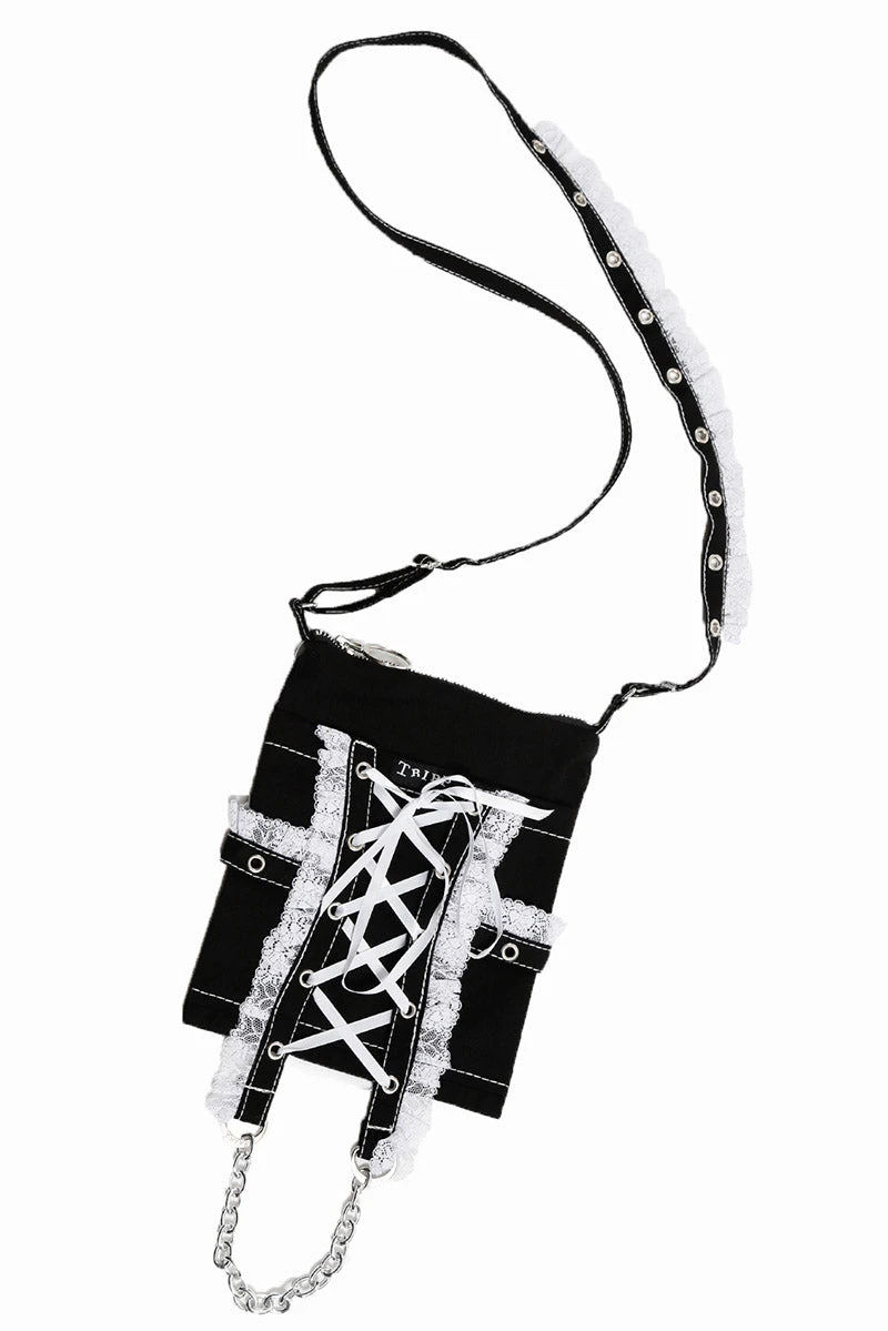 Tote your essentials in this gothic lolita purse, pretty and punk as you! Dark and darling, this statement bag features a corset body charmed with white ribbon lacing. With a sturdy zipper closure, this cute and creepy purse features silver chains, metal eyelets, and romantic ruffles. Finished with an adjustable shoulder strap, enchanted with metal eyelet hardware.
